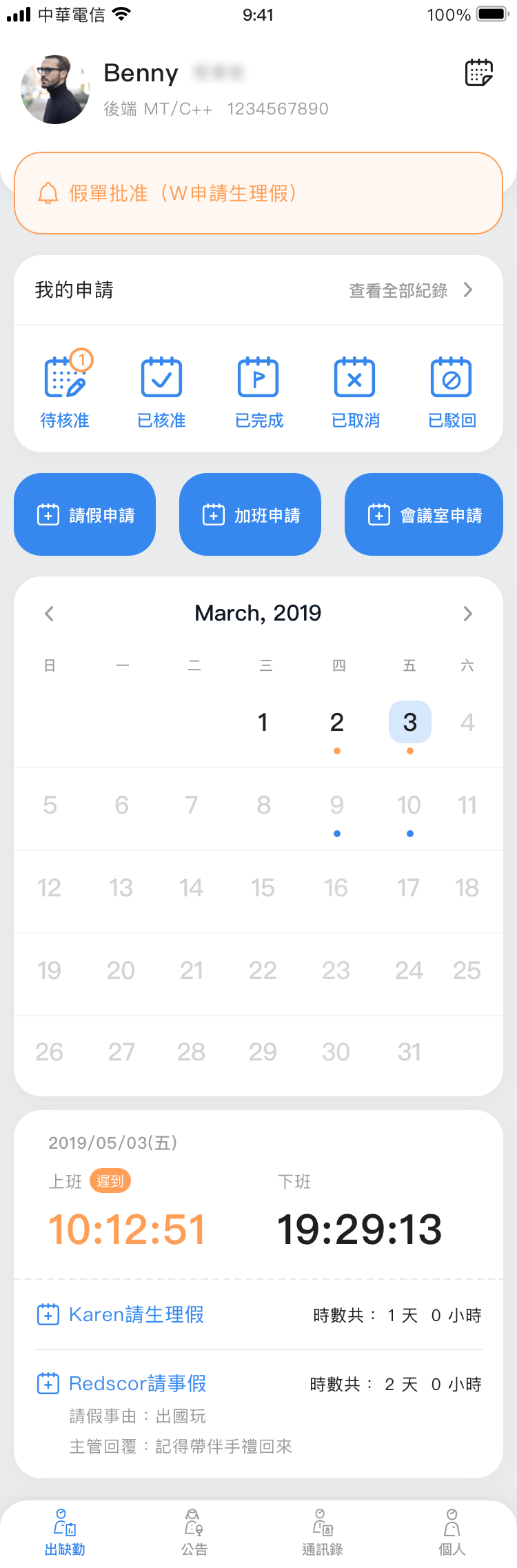 以公司出缺勤查詢系統作為原型,優化視覺、增強易用性,並添加請假/加班功能將紙本作業電子化。